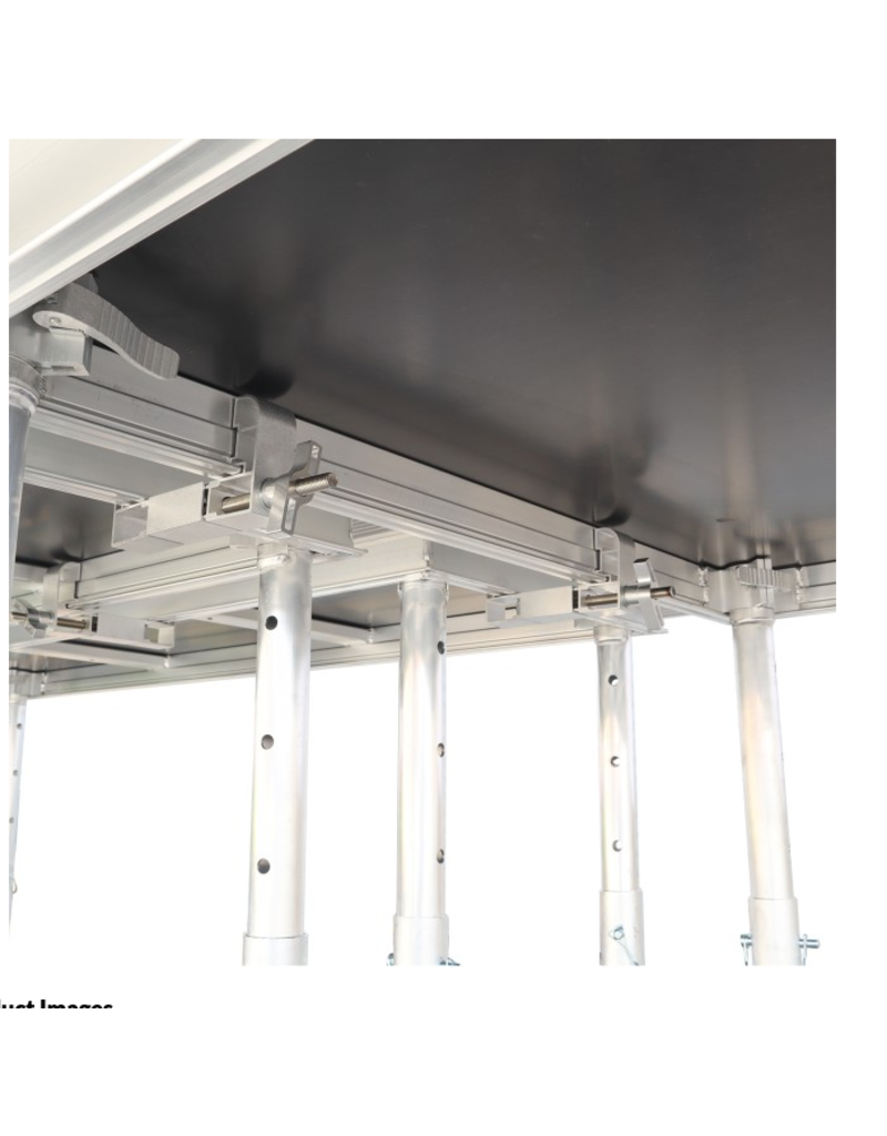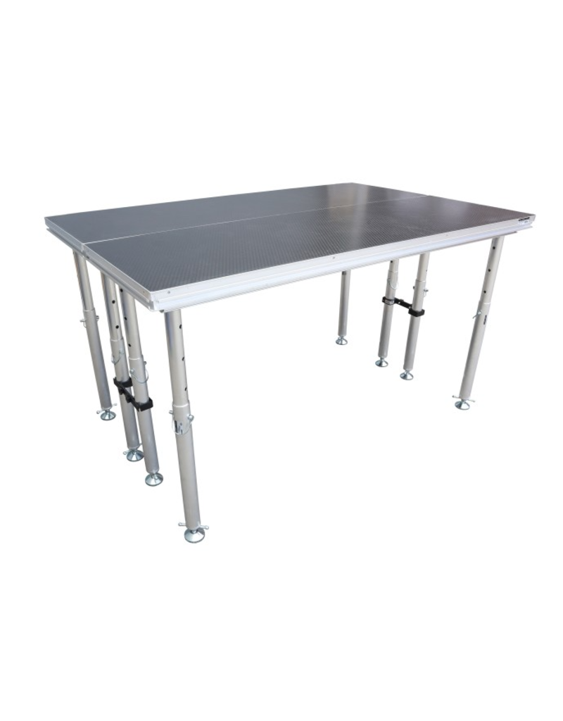 Each stage has our Signature Honeycomb Digital top laminate which has a rugged hexagonal pattern that creates foot grip and traction. They are meant for outdoor and indoor applications. The included telescoping legs adjust from 28-48" which is set by a locking pin. Each leg has a ball joint above the rubber feet that can be adjusted in height to adjust to precision for the ground level.